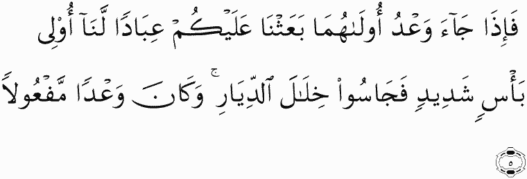So when the [time of] promise came for the first of them, We sent against you servants of Ours - those of great military might, and they probed [even] into the homes, and it was a promise fulfilled.