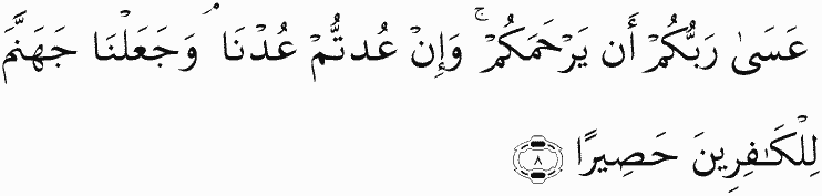 [Then Allah said], "It is expected, [if you repent], that your Lord will have mercy upon you. But if you return [to sin], We will return [to punishment]. And We have made Hell, for the disbelievers, a prison-bed."