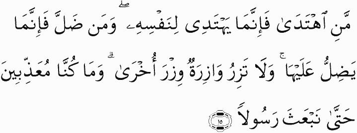 Whoever is guided is only guided for [the benefit of] his soul. And whoever errs only errs against it. And no bearer of burdens will bear the burden of another. And never would We punish until We sent a messenger.