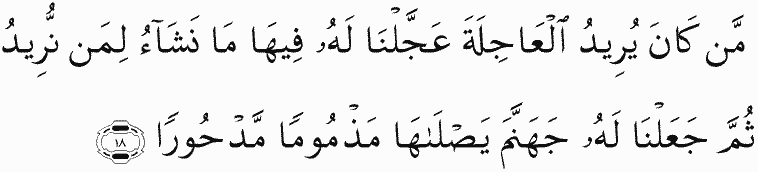 Whoever should desire the immediate - We hasten for him from it what We will to whom We intend. Then We have made for him Hell, which he will [enter to] burn, censured and banished.
