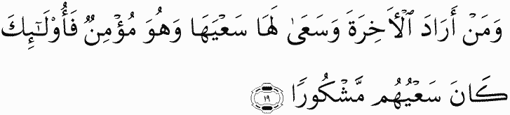 But whoever desires the Hereafter and exerts the effort due to it while he is a believer - it is those whose effort is ever appreciated [by Allah ].