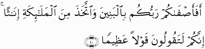 Then, has your Lord chosen you for [having] sons and taken from among the angels daughters? Indeed, you say a grave saying.