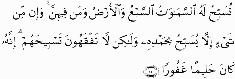 The seven heavens and the earth and whatever is in them exalt Him. And there is not a thing except that it exalts [ Allah ] by His praise, but you do not understand their [way of] exalting. Indeed, He is ever Forbearing and Forgiving.