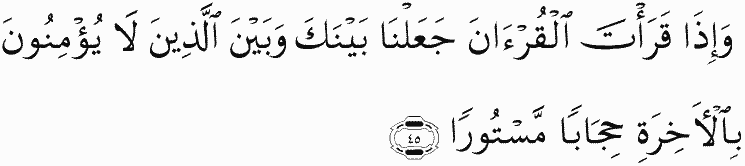 And when you recite the Qur'an, We put between you and those who do not believe in the Hereafter a concealed partition.