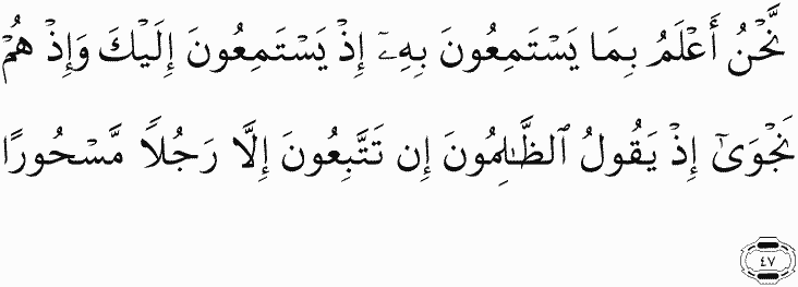 We are most knowing of how they listen to it when they listen to you and [of] when they are in private conversation, when the wrongdoers say, "You follow not but a man affected by magic."