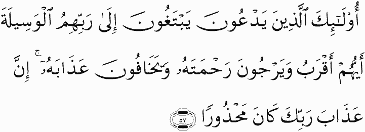 Those whom they invoke seek means of access to their Lord, [striving as to] which of them would be nearest, and they hope for His mercy and fear His punishment. Indeed, the punishment of your Lord is ever feared.