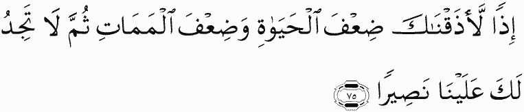 Then [if you had], We would have made you taste double [punishment in] life and double [after] death. Then you would not find for yourself against Us a helper.