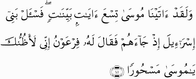 And We had certainly given Moses nine evident signs, so ask the Children of Israel [about] when he came to them and Pharaoh said to him, "Indeed I think, O Moses, that you are affected by magic."