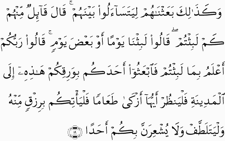 And similarly, We awakened them that they might question one another. Said a speaker from among them, "How long have you remained [here]?" They said, "We have remained a day or part of a day." They said, "Your Lord is most knowing of how long you remained. So send one of you with this silver coin of yours to the city and let him look to which is the best of food and bring you provision from it and let him be cautious. And let no one be aware of you.