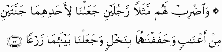 And present to them an example of two men: We granted to one of them two gardens of grapevines, and We bordered them with palm trees and placed between them [fields of] crops.