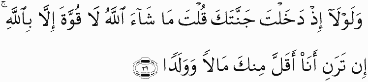 And why did you, when you entered your garden, not say, 'What Allah willed [has occurred]; there is no power except in Allah '? Although you see me less than you in wealth and children,