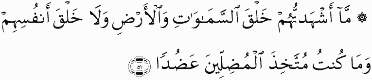 I did not make them witness to the creation of the heavens and the earth or to the creation of themselves, and I would not have taken the misguiders as assistants.