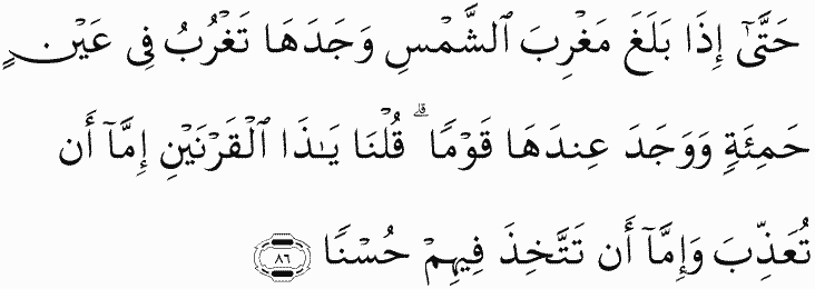 Until, when he reached the setting of the sun, he found it [as if] setting in a spring of dark mud, and he found near it a people. Allah said, "O Dhul-Qarnayn, either you punish [them] or else adopt among them [a way of] goodness."