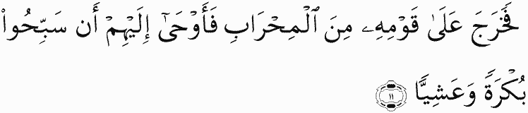 So he came out to his people from the prayer chamber and signaled to them to exalt [ Allah ] in the morning and afternoon.