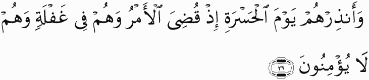 And warn them, [O Muhammad], of the Day of Regret, when the matter will be concluded; and [yet], they are in [a state of] heedlessness, and they do not believe.