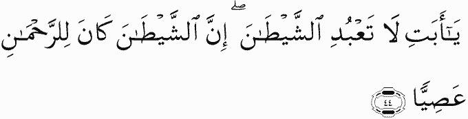 O my father, do not worship Satan. Indeed Satan has ever been, to the Most Merciful, disobedient.
