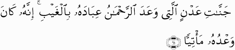 [Therein are] gardens of perpetual residence which the Most Merciful has promised His servants in the unseen. Indeed, His promise has ever been coming.