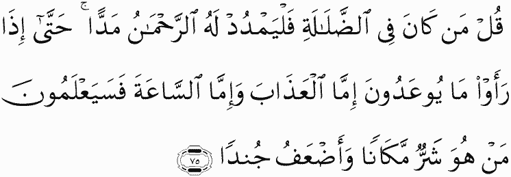Say, "Whoever is in error - let the Most Merciful extend for him an extension [in wealth and time] until, when they see that which they were promised - either punishment [in this world] or the Hour [of resurrection] - they will come to know who is worst in position and weaker in soldiers."