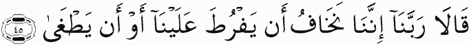 They said, "Our Lord, indeed we are afraid that he will hasten [punishment] against us or that he will transgress."