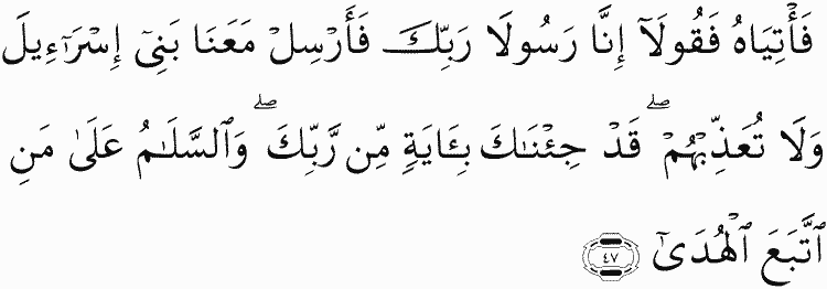 So go to him and say, 'Indeed, we are messengers of your Lord, so send with us the Children of Israel and do not torment them. We have come to you with a sign from your Lord. And peace will be upon he who follows the guidance.