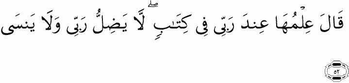 [Moses] said, "The knowledge thereof is with my Lord in a record. My Lord neither errs nor forgets."