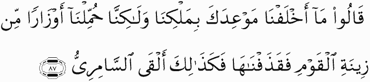 They said, "We did not break our promise to you by our will, but we were made to carry burdens from the ornaments of the people [of Pharaoh], so we threw them [into the fire], and thus did the Samiri throw."