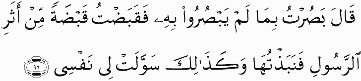 He said, "I saw what they did not see, so I took a handful [of dust] from the track of the messenger and threw it, and thus did my soul entice me."