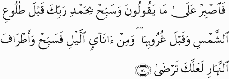 So be patient over what they say and exalt [ Allah ] with praise of your Lord before the rising of the sun and before its setting; and during periods of the night [exalt Him] and at the ends of the day, that you may be satisfied.