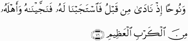 And [mention] Noah, when he called [to Allah ] before [that time], so We responded to him and saved him and his family from the great flood.