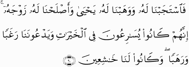 So We responded to him, and We gave to him John, and amended for him his wife. Indeed, they used to hasten to good deeds and supplicate Us in hope and fear, and they were to Us humbly submissive.