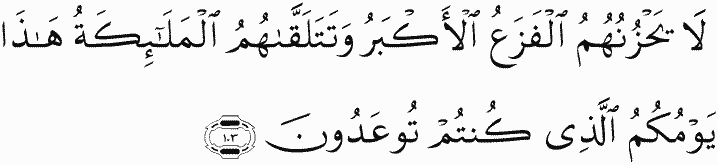 They will not be grieved by the greatest terror, and the angels will meet them, [saying], "This is your Day which you have been promised" -
