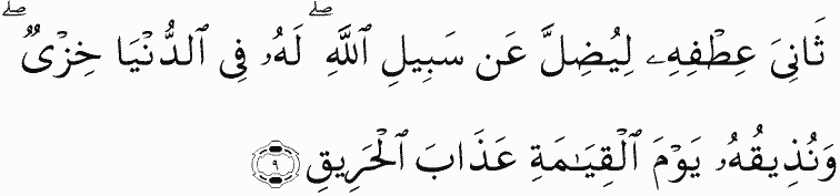 Twisting his neck [in arrogance] to mislead [people] from the way of Allah . For him in the world is disgrace, and We will make him taste on the Day of Resurrection the punishment of the Burning Fire [while it is said],