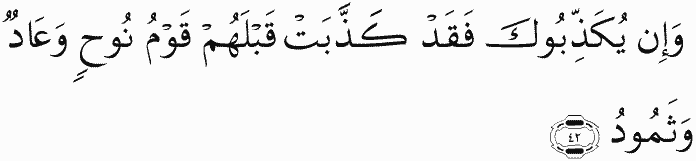And if they deny you, [O Muhammad] - so, before them, did the people of Noah and 'Aad and Thamud deny [their prophets],