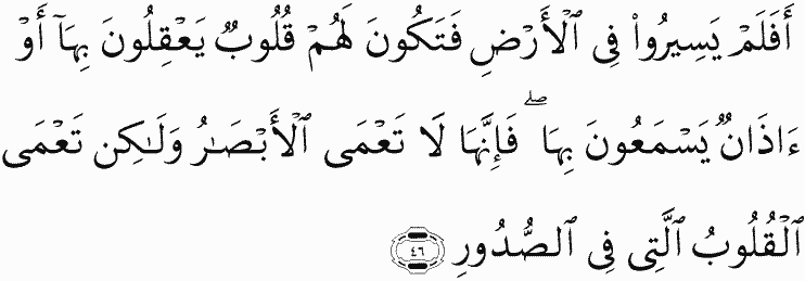 So have they not traveled through the earth and have hearts by which to reason and ears by which to hear? For indeed, it is not eyes that are blinded, but blinded are the hearts which are within the breasts.