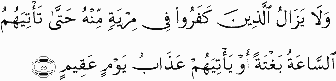 But those who disbelieve will not cease to be in doubt of it until the Hour comes upon them unexpectedly or there comes to them the punishment of a barren Day.