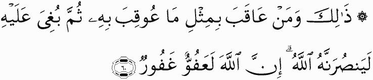 That [is so]. And whoever responds [to injustice] with the equivalent of that with which he was harmed and then is tyrannized - Allah will surely aid him. Indeed, Allah is Pardoning and Forgiving.