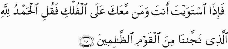 And when you have boarded the ship, you and those with you, then say, 'Praise to Allah who has saved us form the wrongdoing people.'