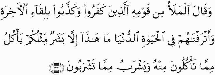 And the eminent among his people who disbelieved and denied the meeting of the Hereafter while We had given them luxury in the worldly life said, "This is not but a man like yourselves. He eats of that from which you eat and drinks of what you drink.
