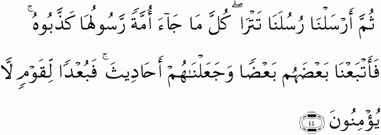 Then We sent Our messengers in succession. Every time there came to a nation its messenger, they denied him, so We made them follow one another [to destruction], and We made them narrations. So away with a people who do not believe.