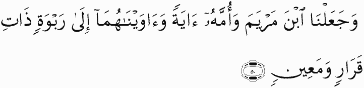 And We made the son of Mary and his mother a sign and sheltered them within a high ground having level [areas] and flowing water.