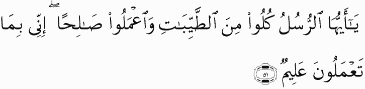 [ Allah said], "O messengers, eat from the good foods and work righteousness. Indeed, I, of what you do, am Knowing.