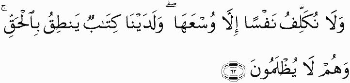 And We charge no soul except [with that within] its capacity, and with Us is a record which speaks with truth; and they will not be wronged.