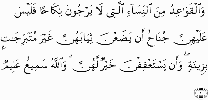 And women of post-menstrual age who have no desire for marriage - there is no blame upon them for putting aside their outer garments [but] not displaying adornment. But to modestly refrain [from that] is better for them. And Allah is Hearing and Knowing.