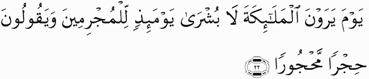 The day they see the angels - no good tidings will there be that day for the criminals, and [the angels] will say, "Prevented and inaccessible."