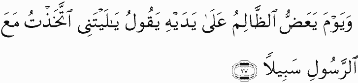 And the Day the wrongdoer will bite on his hands [in regret] he will say, "Oh, I wish I had taken with the Messenger a way.