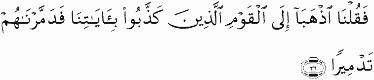 And We said, "Go both of you to the people who have denied Our signs." Then We destroyed them with [complete] destruction.