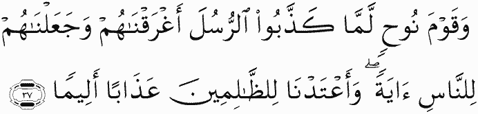 And the people of Noah - when they denied the messengers, We drowned them, and We made them for mankind a sign. And We have prepared for the wrongdoers a painful punishment.
