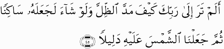 Have you not considered your Lord - how He extends the shadow, and if He willed, He could have made it stationary? Then We made the sun for it an indication.