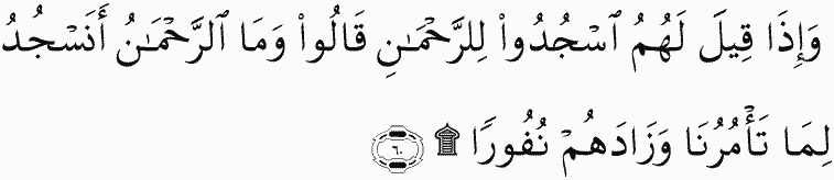And when it is said to them, "Prostrate to the Most Merciful," they say, "And what is the Most Merciful? Should we prostrate to that which you order us?" And it increases them in aversion.