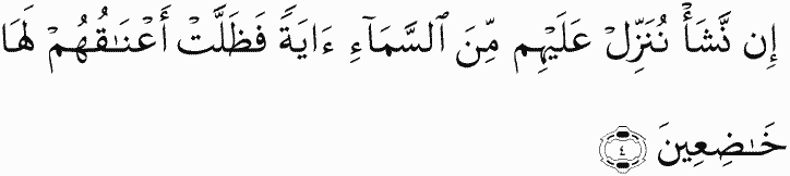 If We willed, We could send down to them from the sky a sign for which their necks would remain humbled.